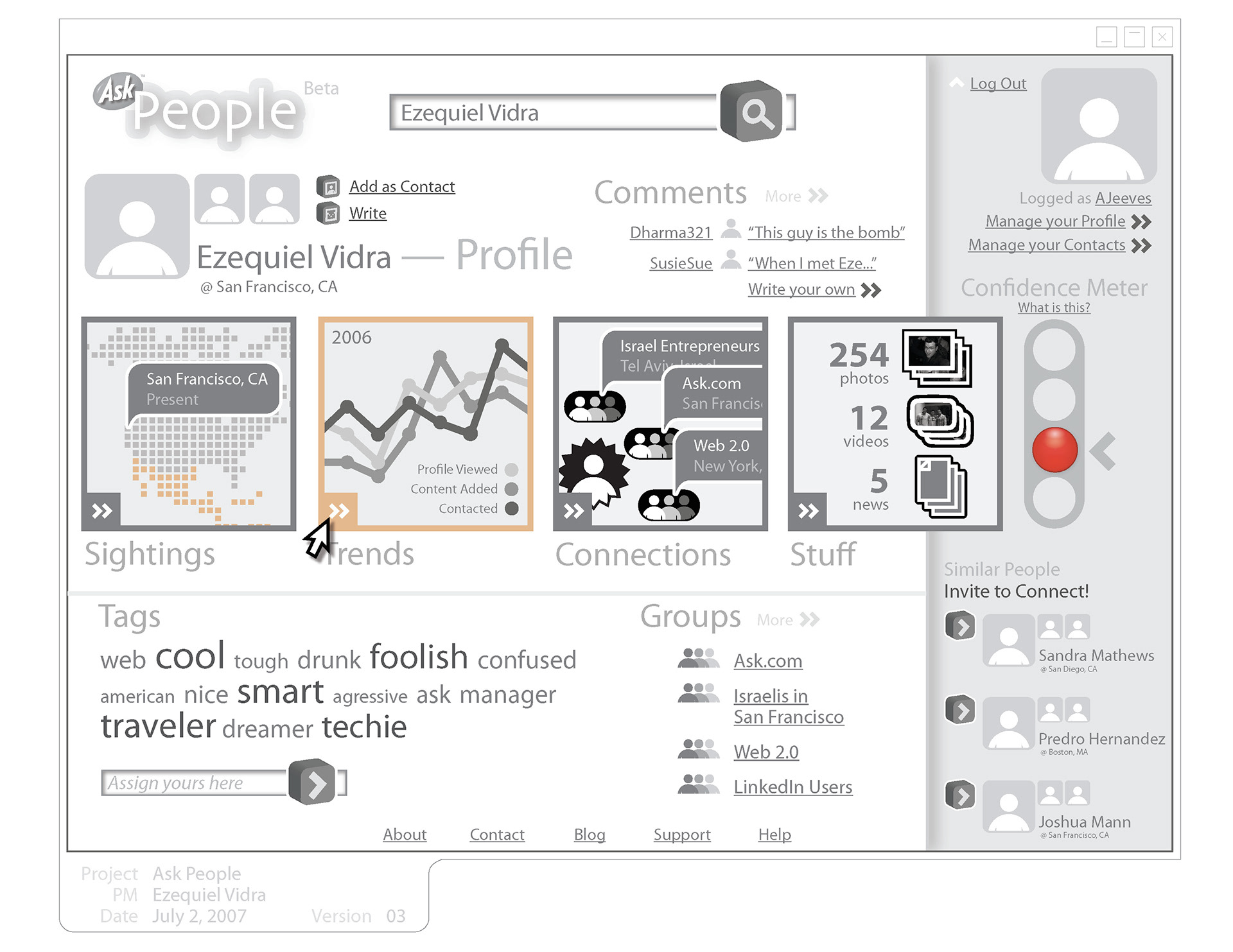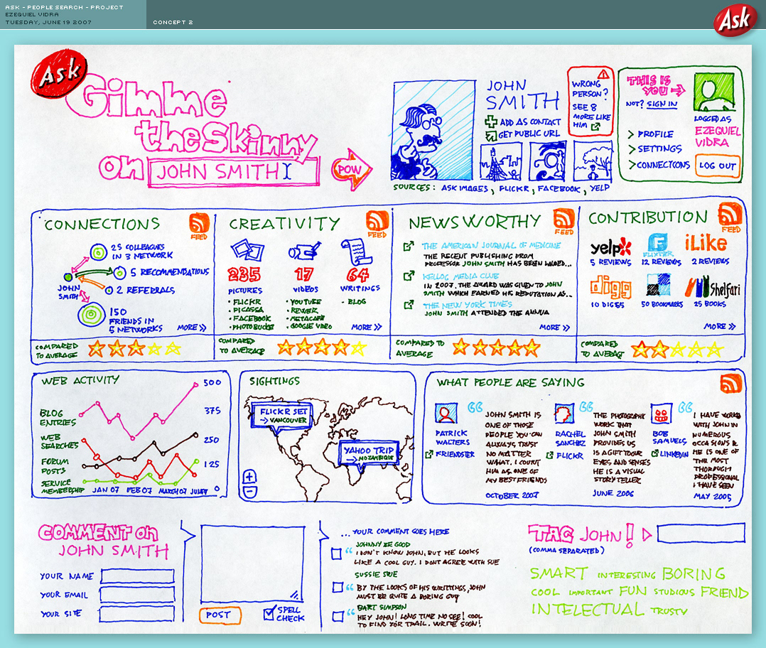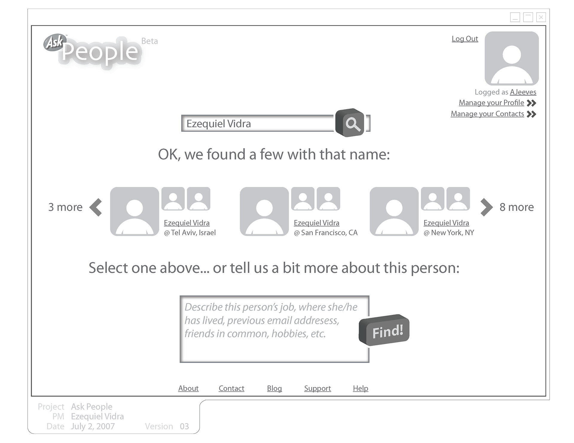 Ask.com developed functioning prototypes for a people search engine. These are the early sketches, wireframes, and proposed functionality.