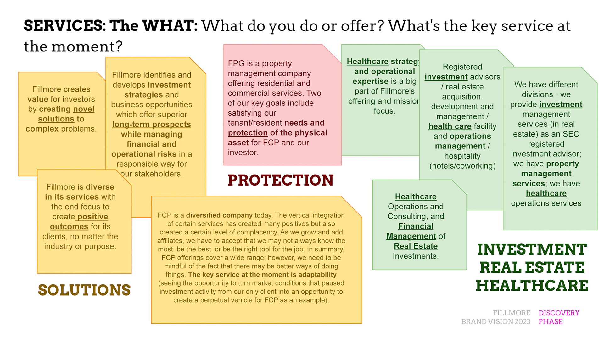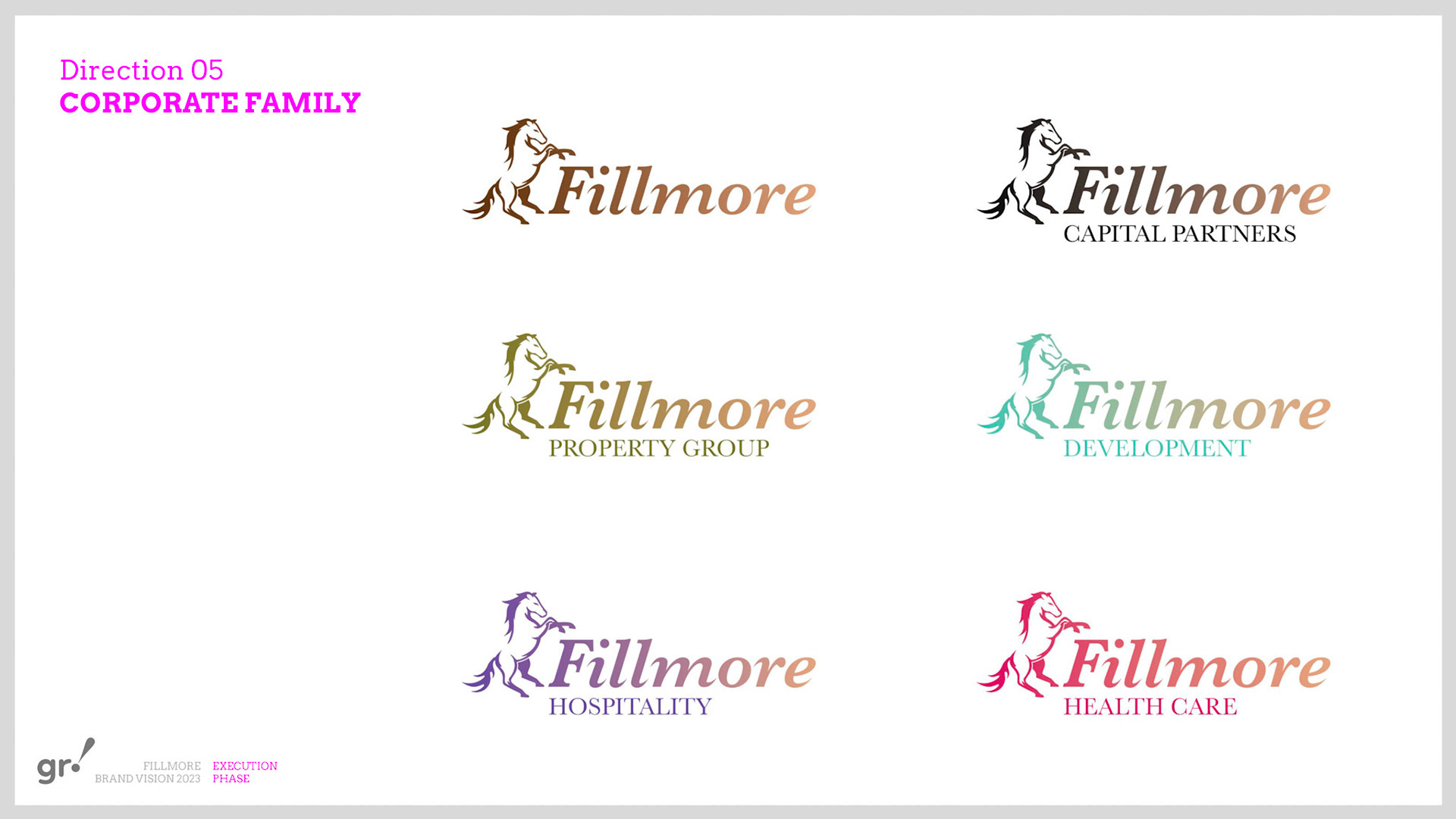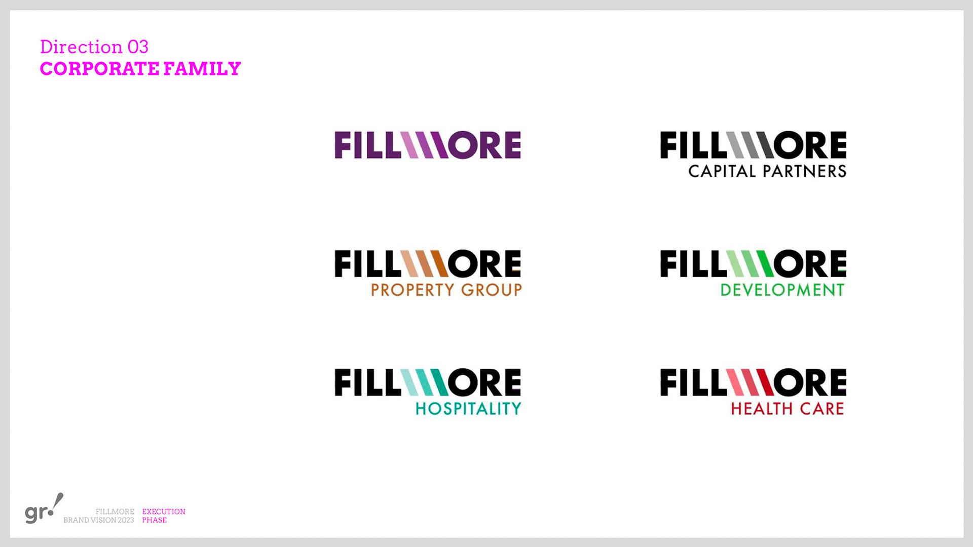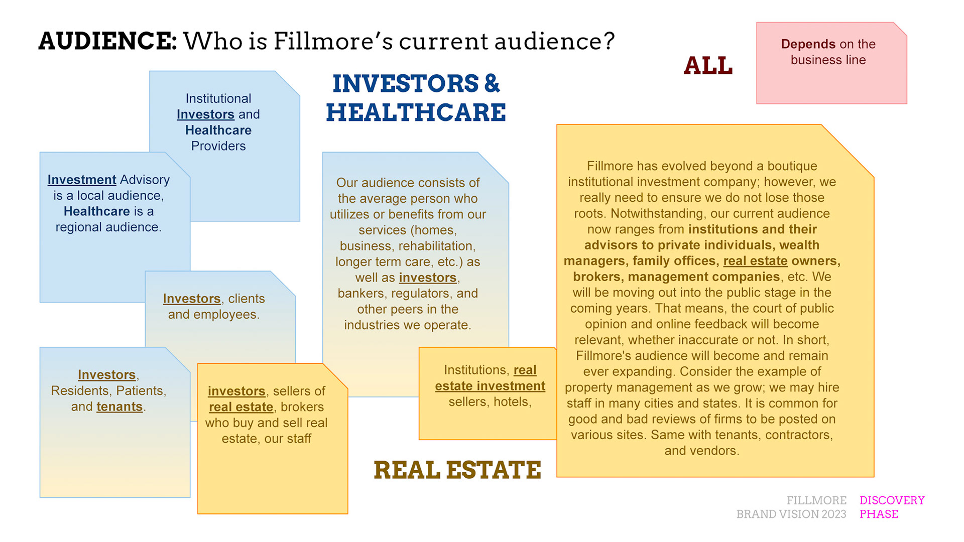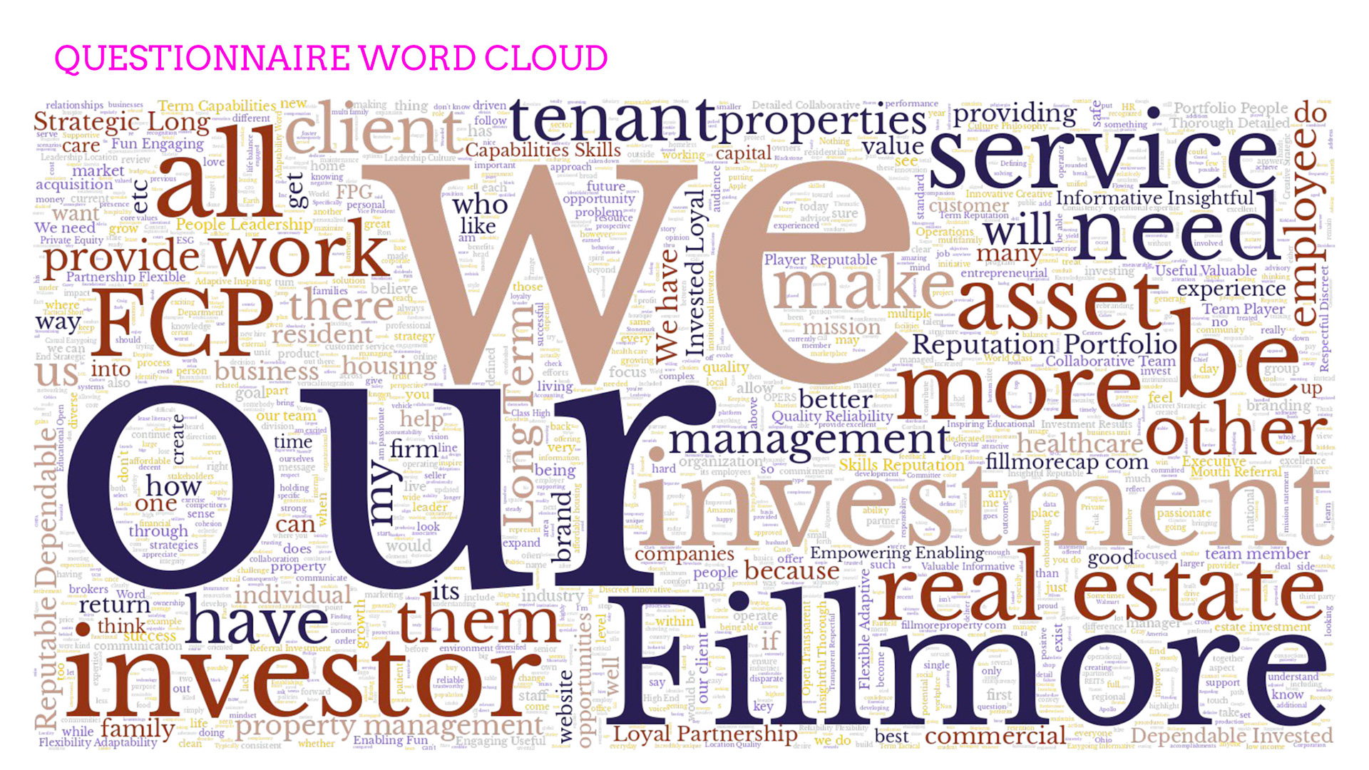 Rebrand of a private equity real estate firm Fillmore Capital Partners LLC, after 1-to-1 interviews and workshops with teams and leadership.