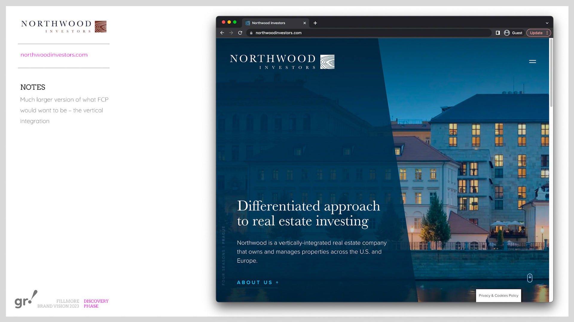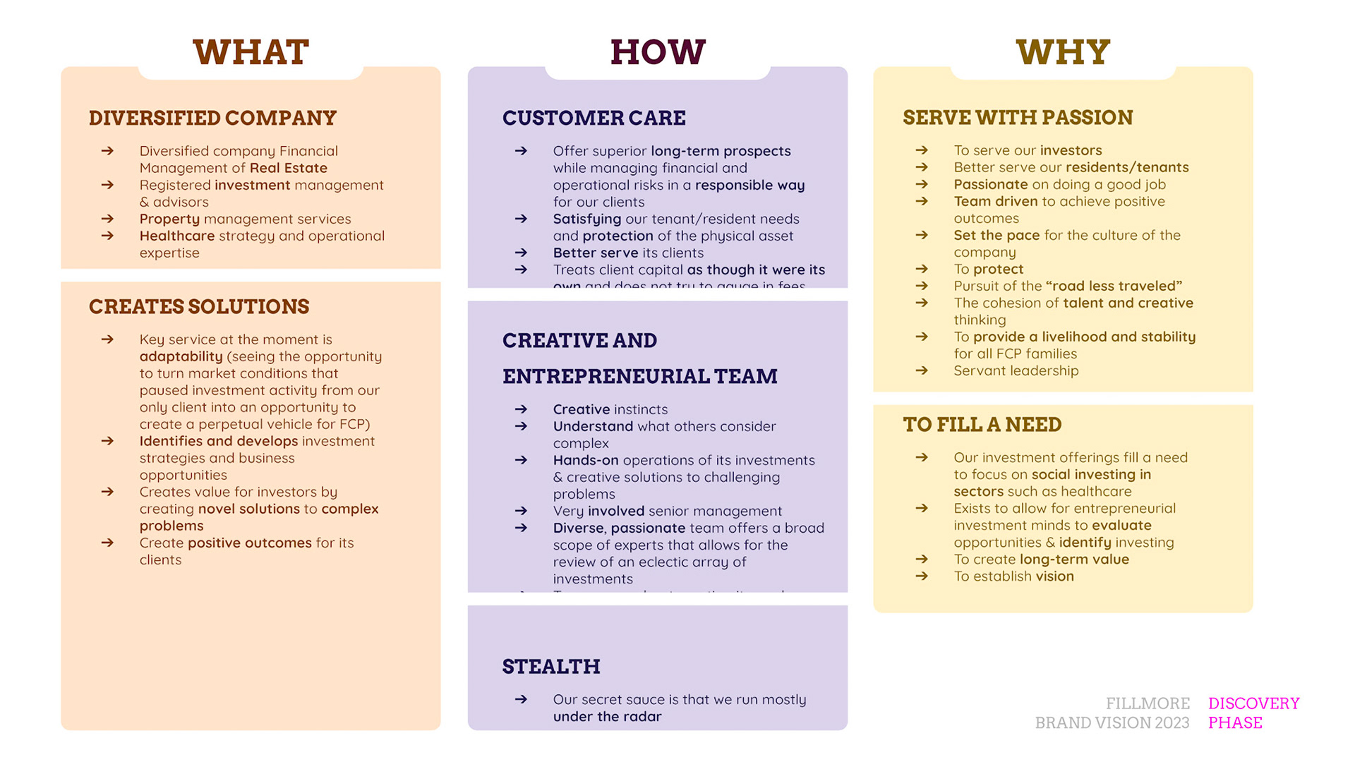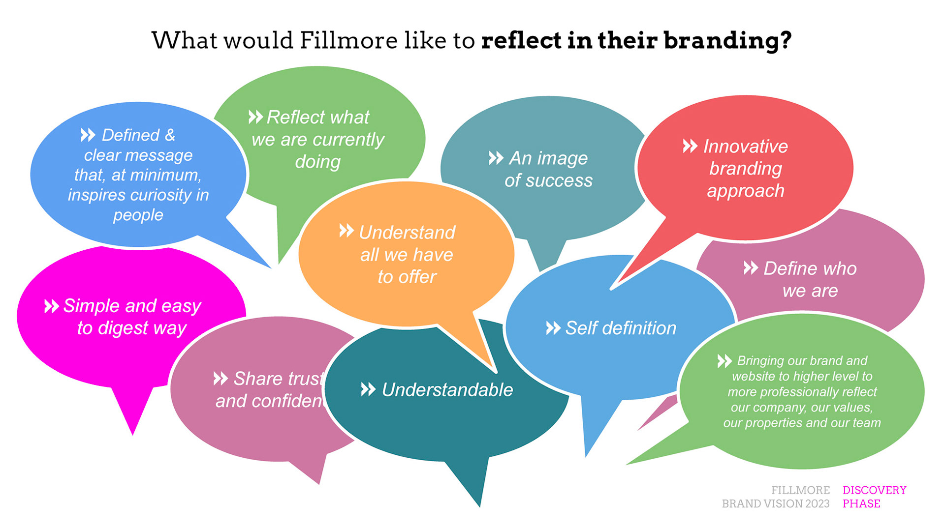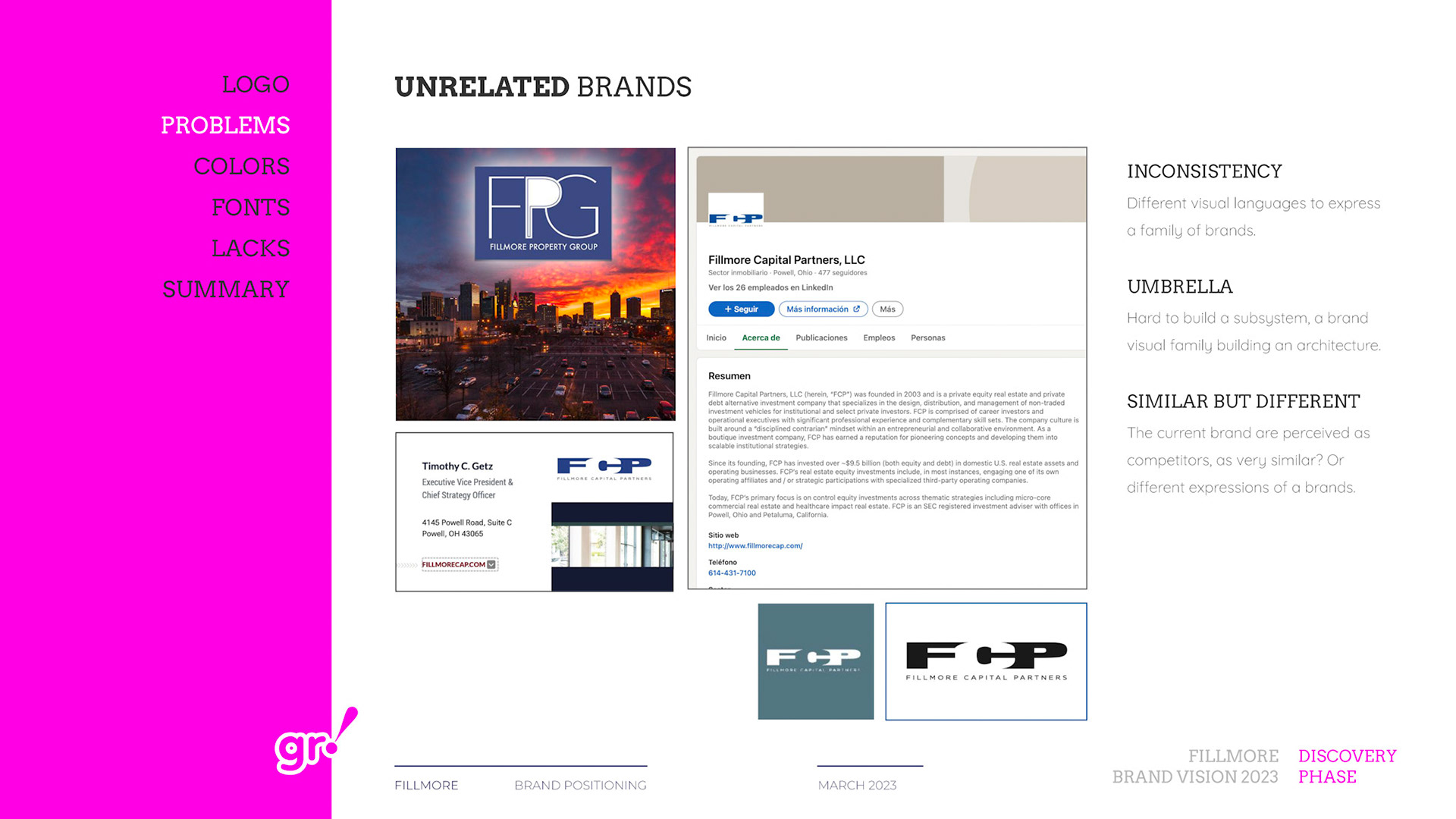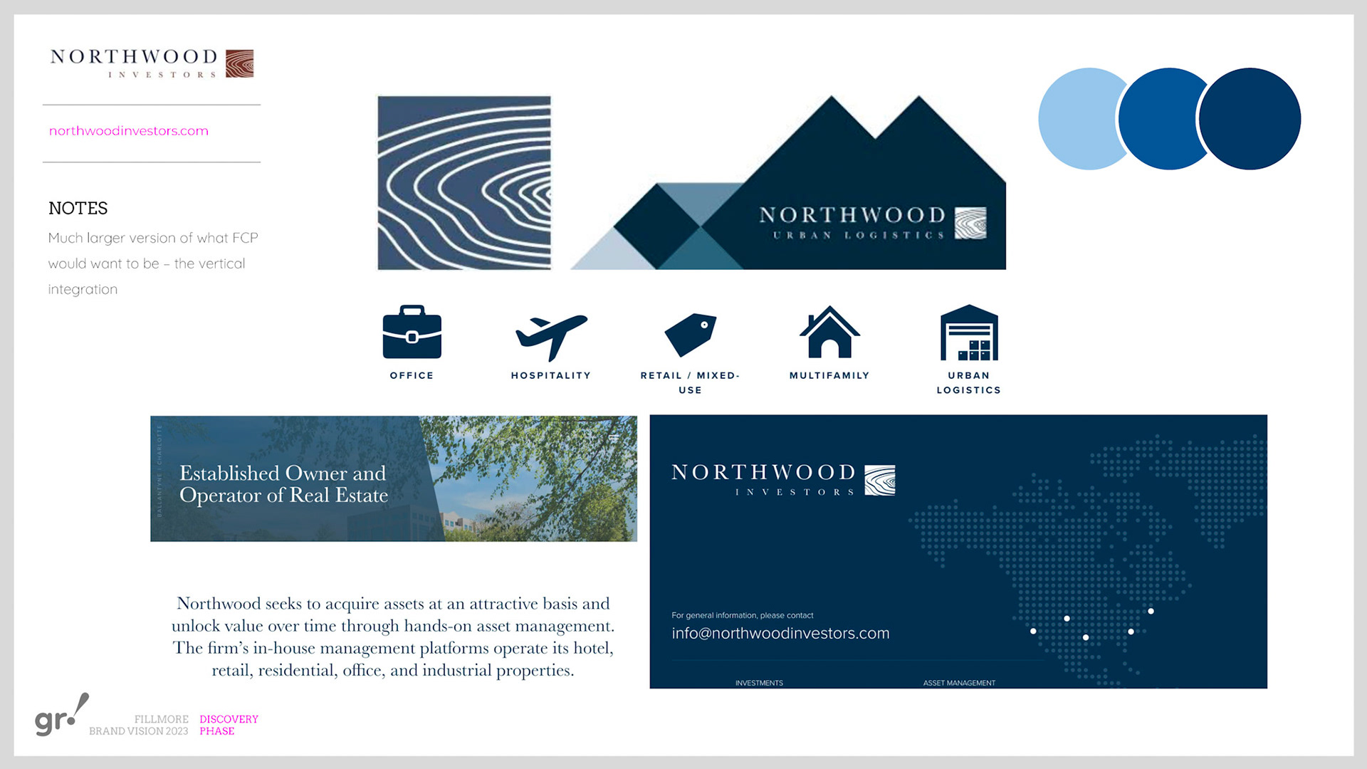 Rebrand of a private equity real estate firm Fillmore Capital Partners LLC, after 1-to-1 interviews and workshops with teams and leadership.