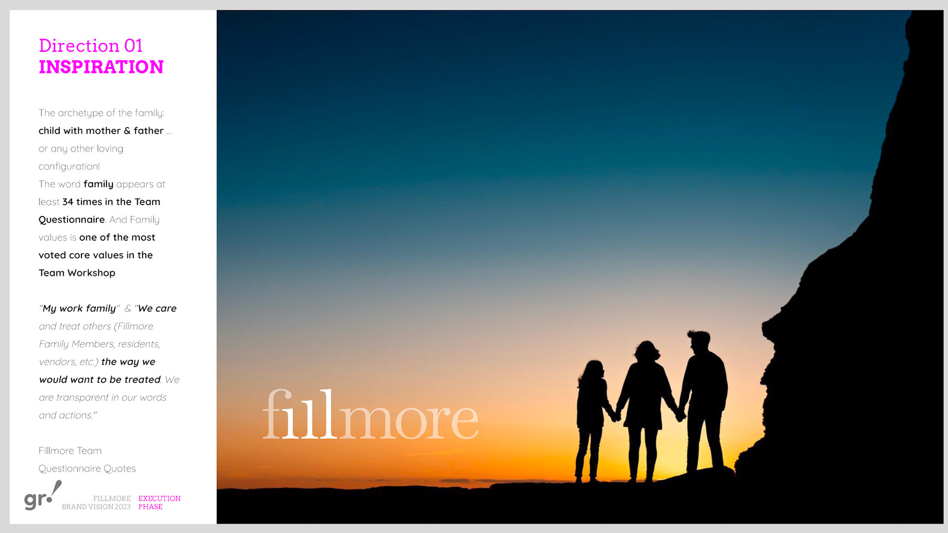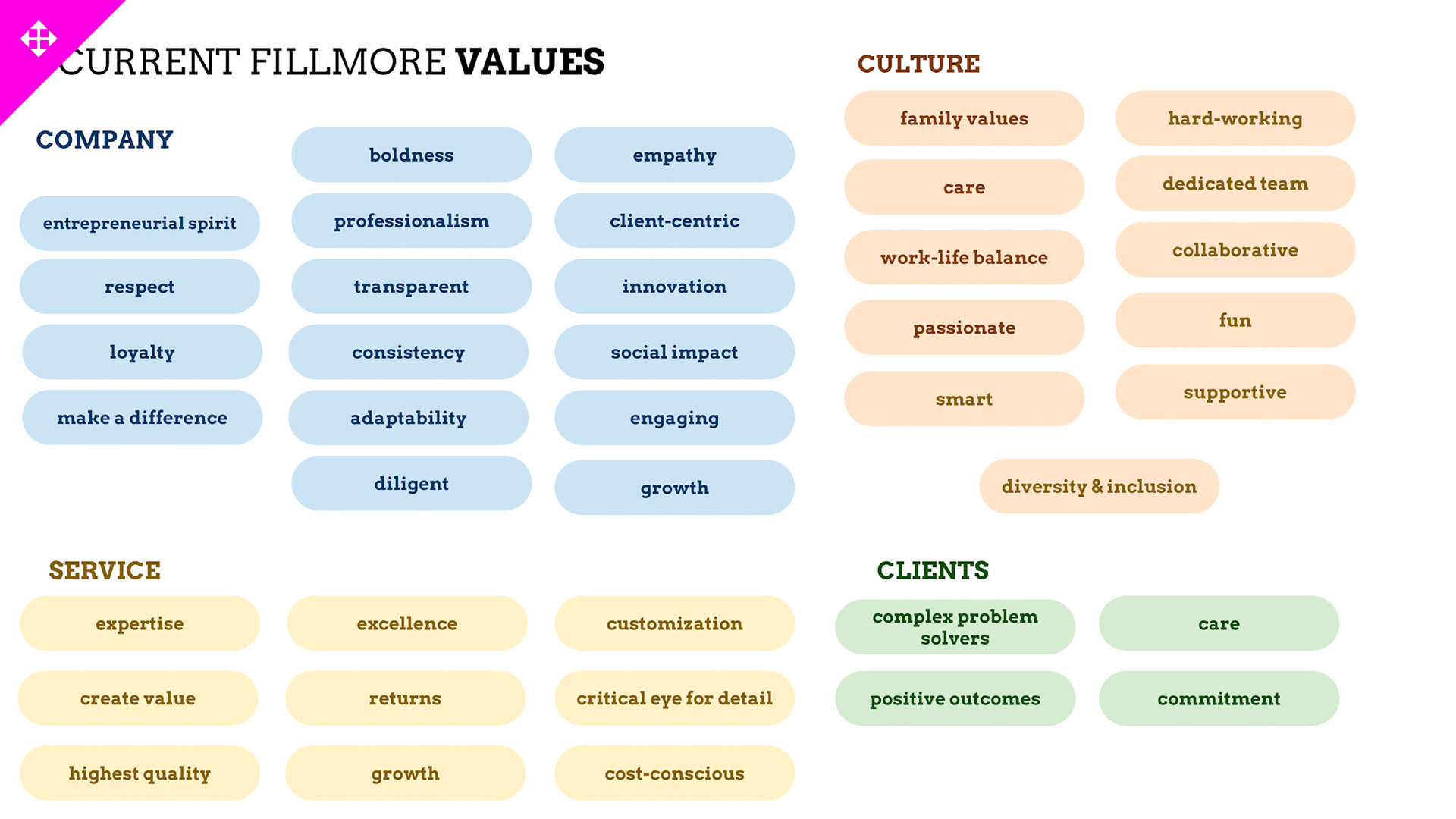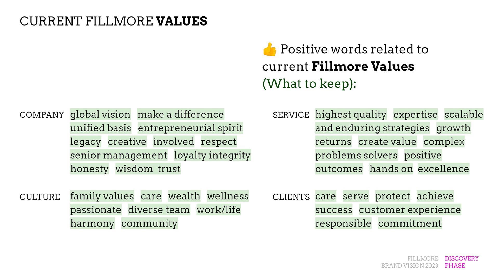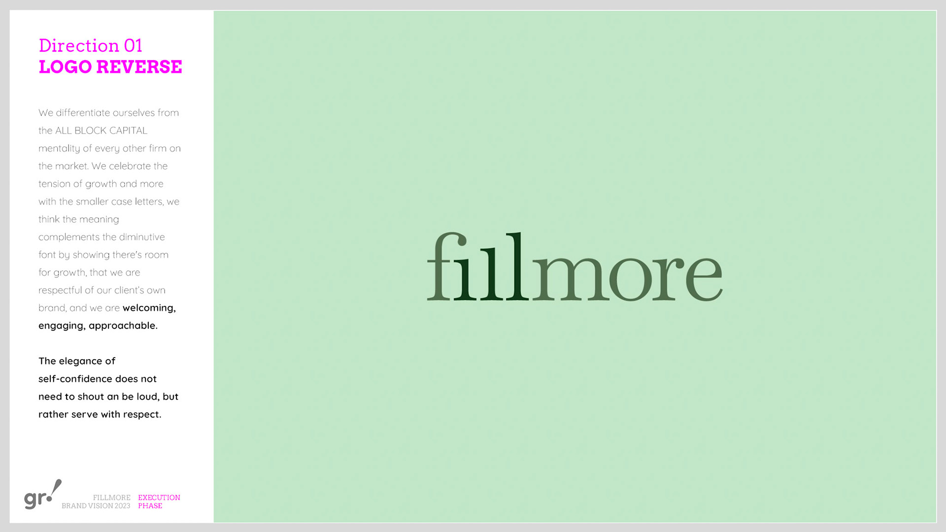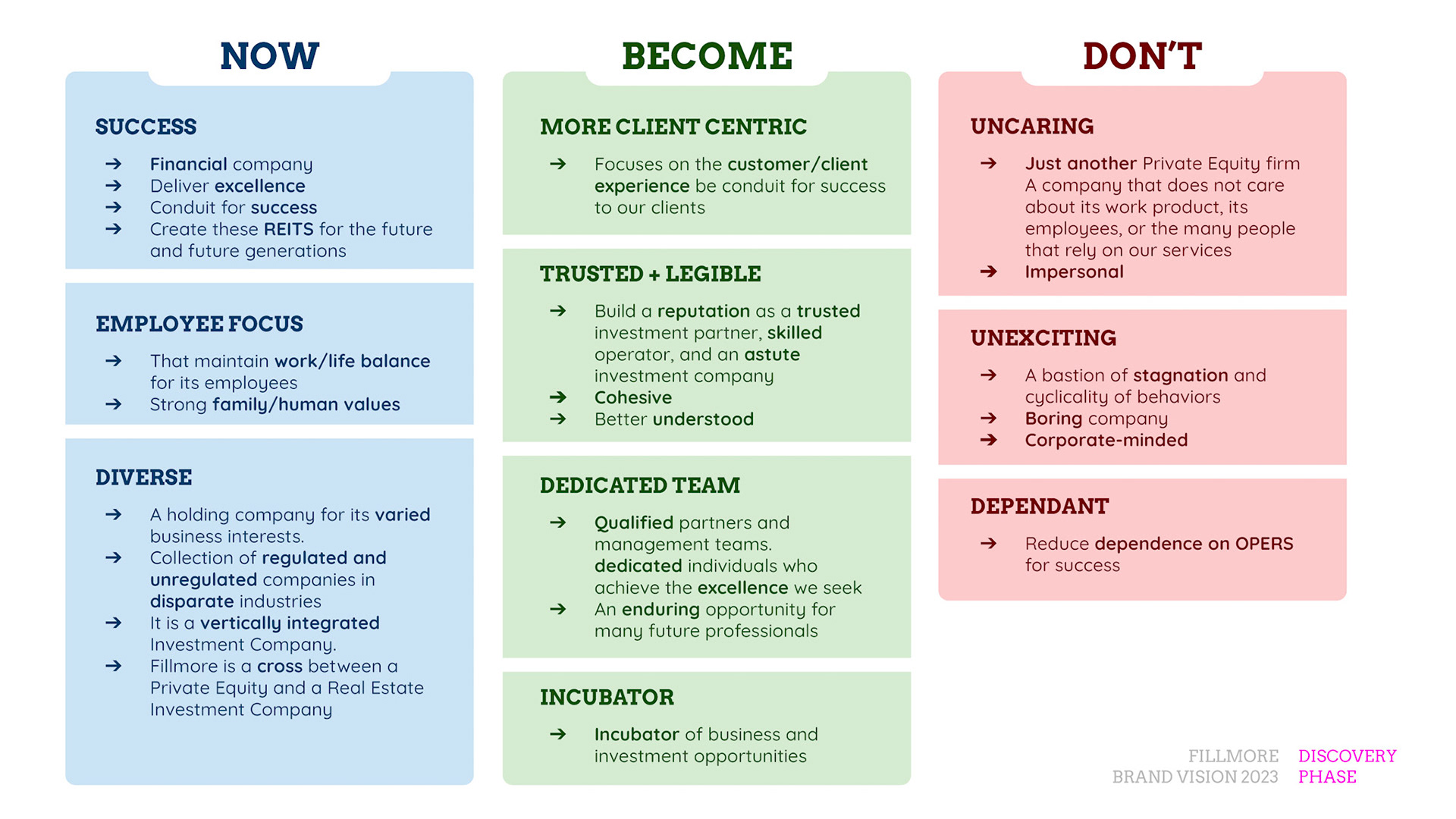 Rebrand of a private equity real estate firm Fillmore Capital Partners LLC, after 1-to-1 interviews and workshops with teams and leadership.