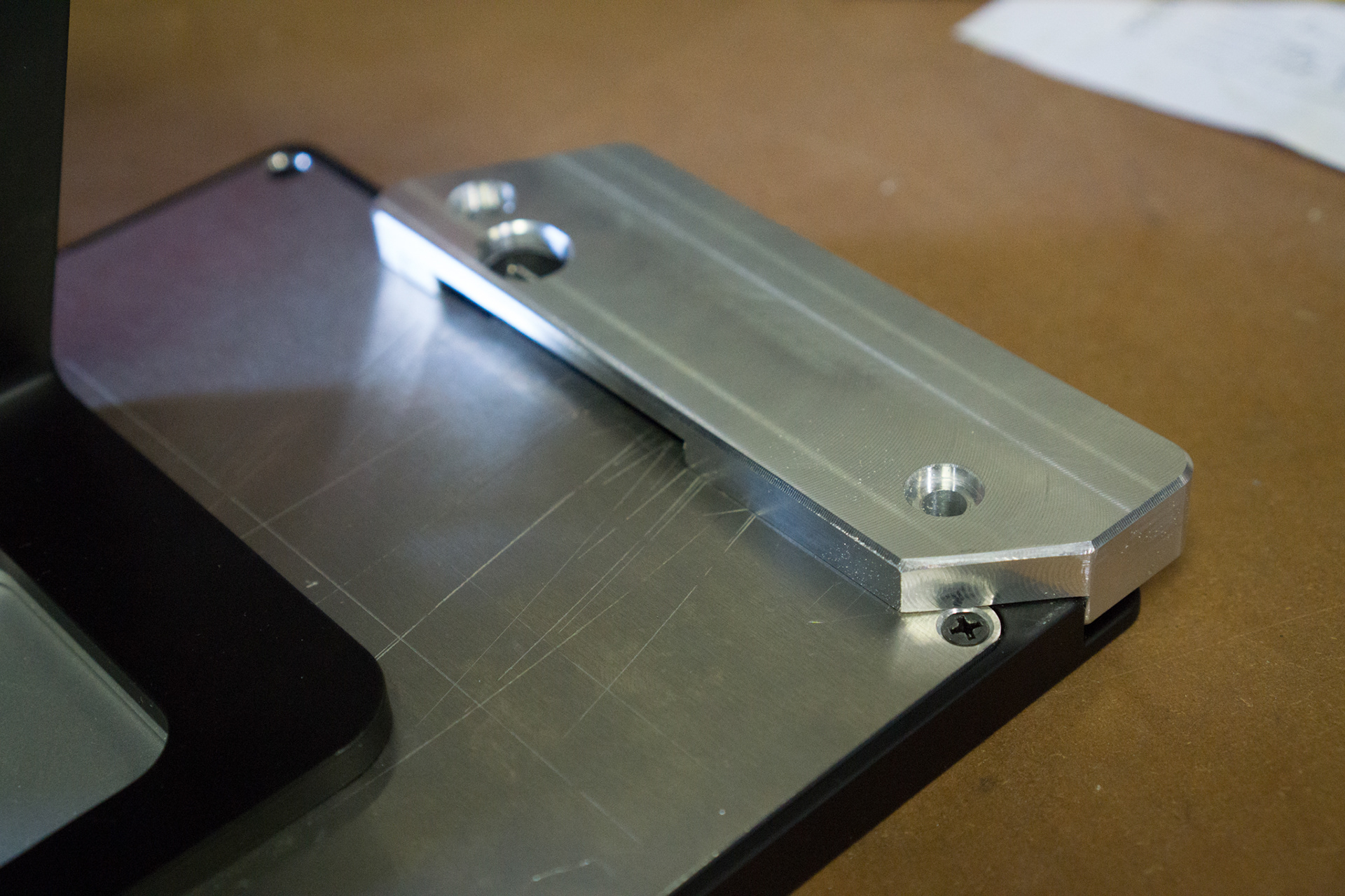 One of many design challenges that we faced was the credit card reader bracket. In order to maintain an overall appearance of simple elegance yet remain modular and adaptable to multiple third-party options, it was important to match the design of this extension to that of the faceplate while still creating an obvious swipe path for the user. It soon became clear that the bracket covered one of the four screws that fasten the faceplate to the backplate which would have required the user to remove the bracket in order to access them (an extra step in the disassembly of the product). By introducing an angled parallelogram as the form of the side bracket, the issue was resolved with elegance.